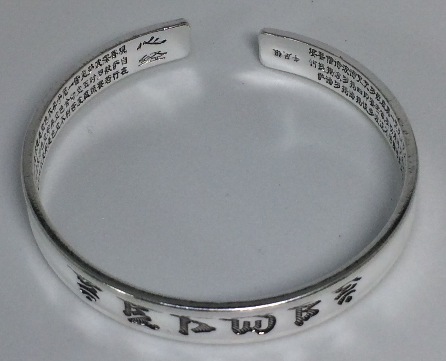 表側は梵語(サンスクリット語)を表す文字「梵字」表記です。 おそらく般若心経と書かれているのでしょう。 読めないので、申し訳ありません。 おそらく1万人に1人も読めないので、お経のブレスレットだと気付かれる心配はありません。 お洒落ブレスレット、実は般若心経ブレスレットという逸品です。 日常ではあまり聞きなれない梵字(ぼんじ)ですが、この文字には秘められた力があると言われていて、特に魔除けとして使用されるお札の文字に使われることが多いです。 また般若心経は僅か300字足らずの本文に大乗仏教の心髄が説かれているとされるあまりに有名な仏典。宗派を問わず広く受け継がれています。 仏様、空海様といつも一緒にいられるのは心強いですよね。 銅素材に銀のフィルド(999) 18センチ。